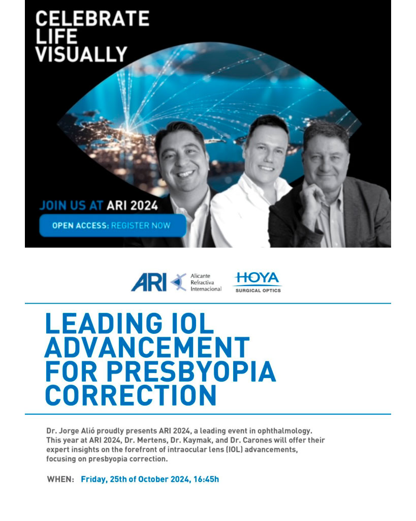 ARI 2024: El Dr. Jorge Alió presentó este evento líder donde expertos como el Dr. Mertens y el Dr. Carones ofrecieron sus conocimientos sobre los avances en lentes intraoculares para la corrección de la presbicia el pasado 25 de octubre.